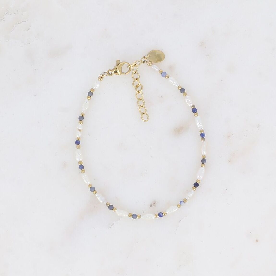 Cable bracelet decorated with pearls, natural stones and freshwater pearls.