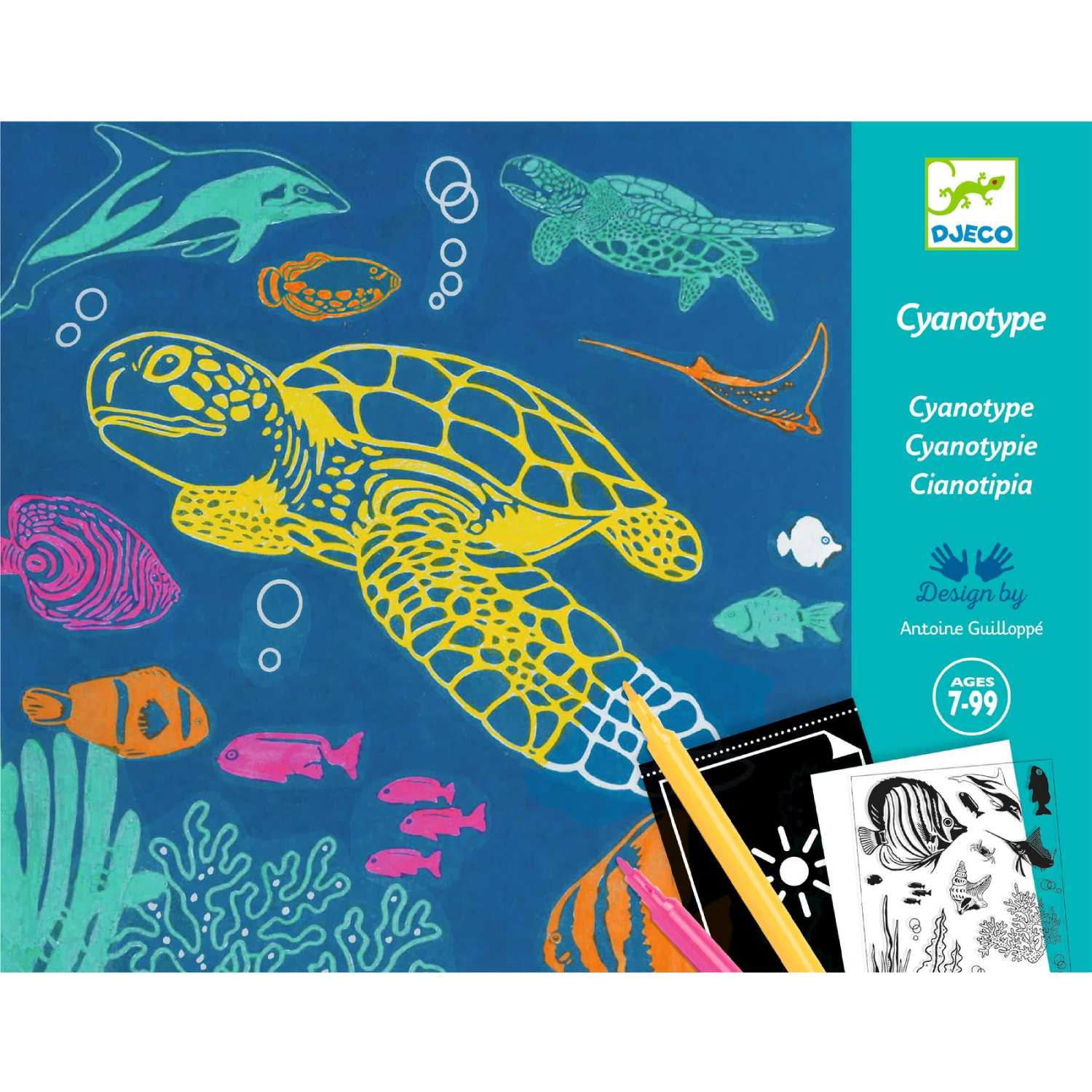 - With 4 felt-tip pens to transform 4 pictures into colourful underwater scenes.