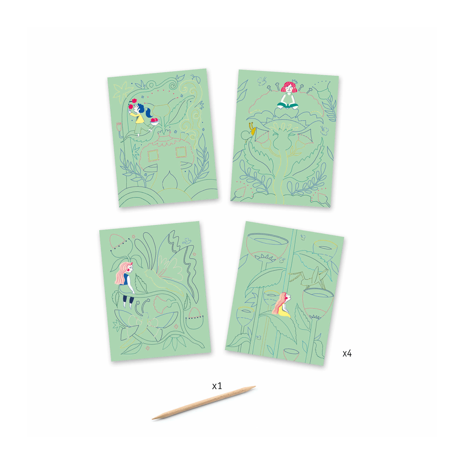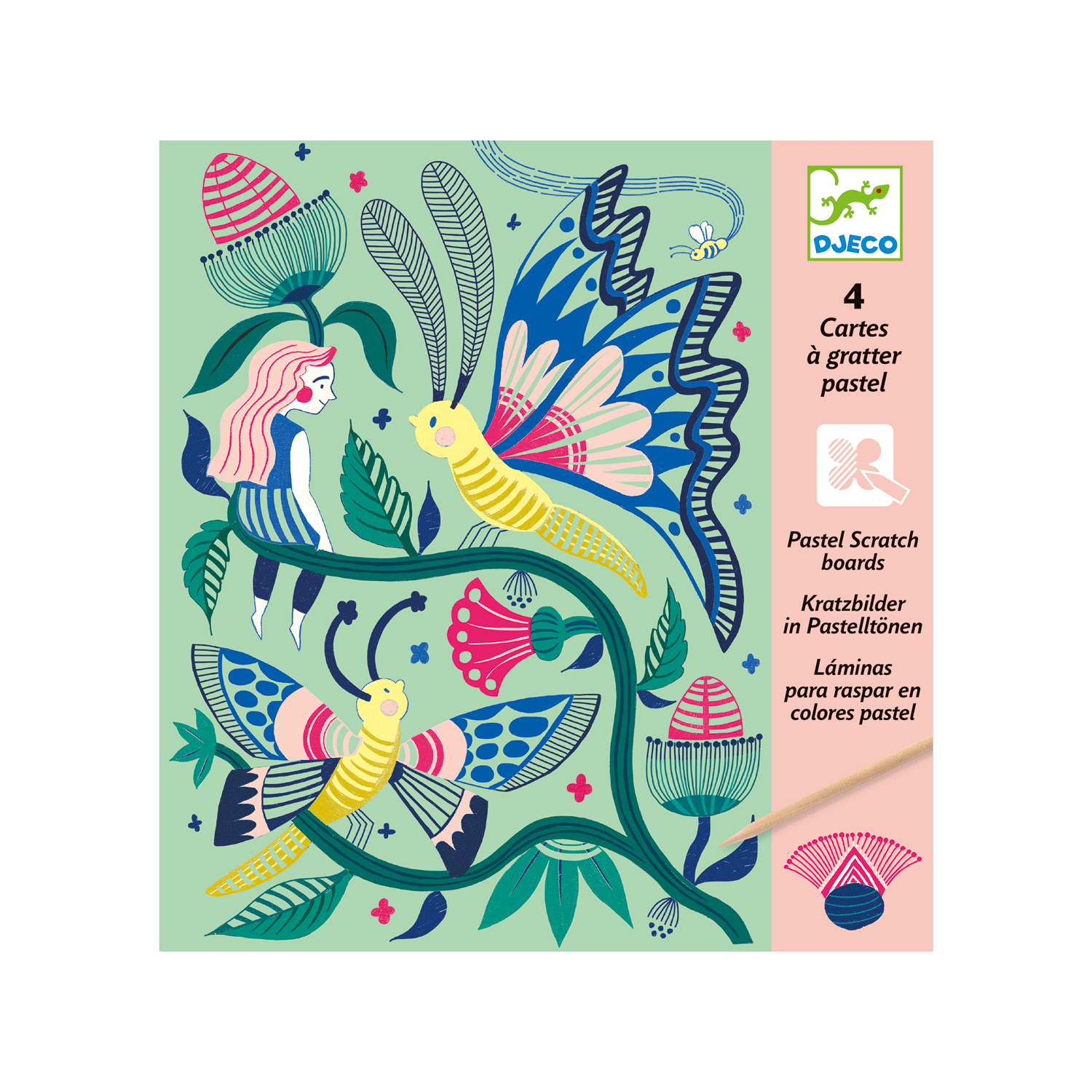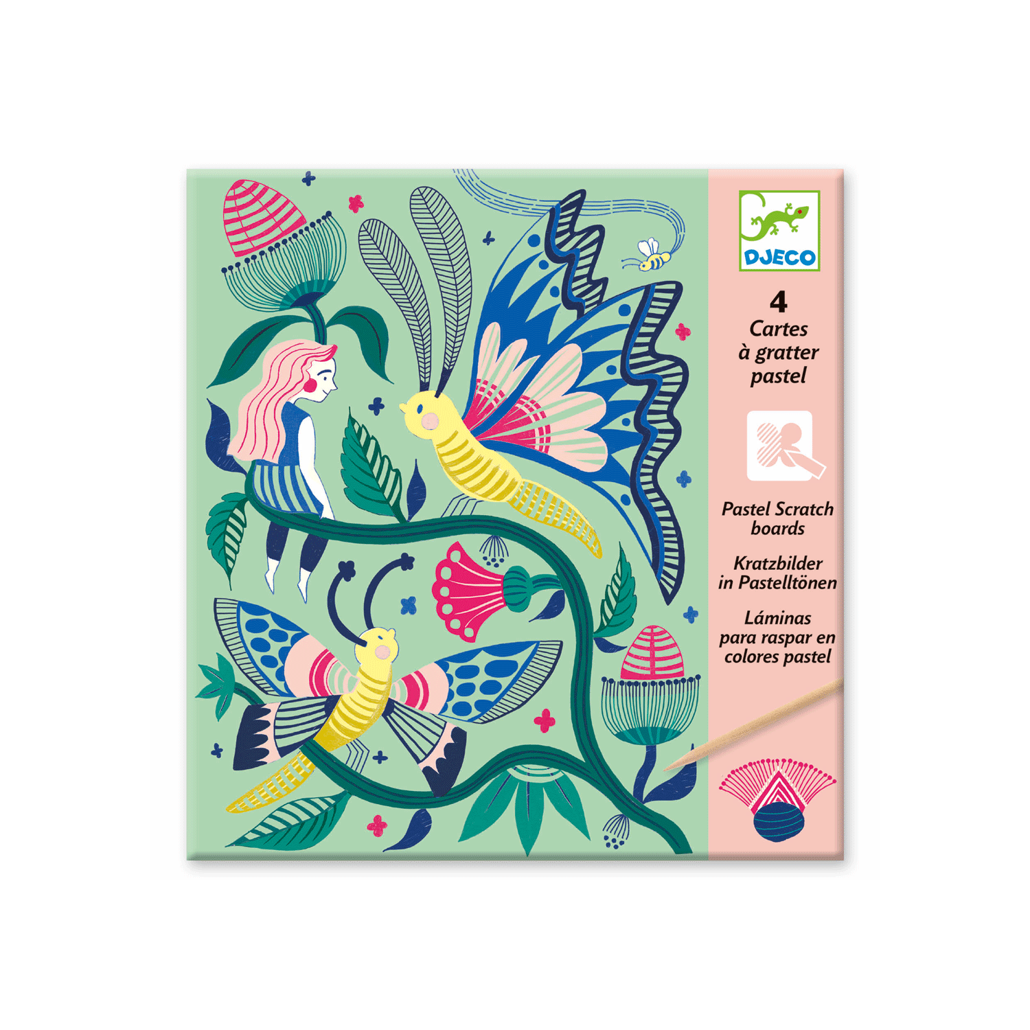 The Djeco scratch boards kit consists of 4 boards, a wooden stylet and a booklet of instructions.