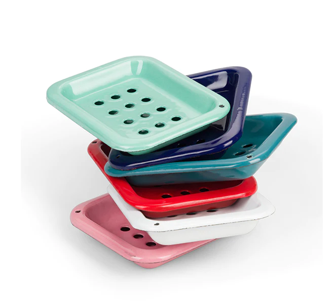 We love our enamel soap dish. This classic design has two pieces: the holed upper section keeps the soap dry, while the base catches drips and facilitates cleaning. The only question is which colour to choose?