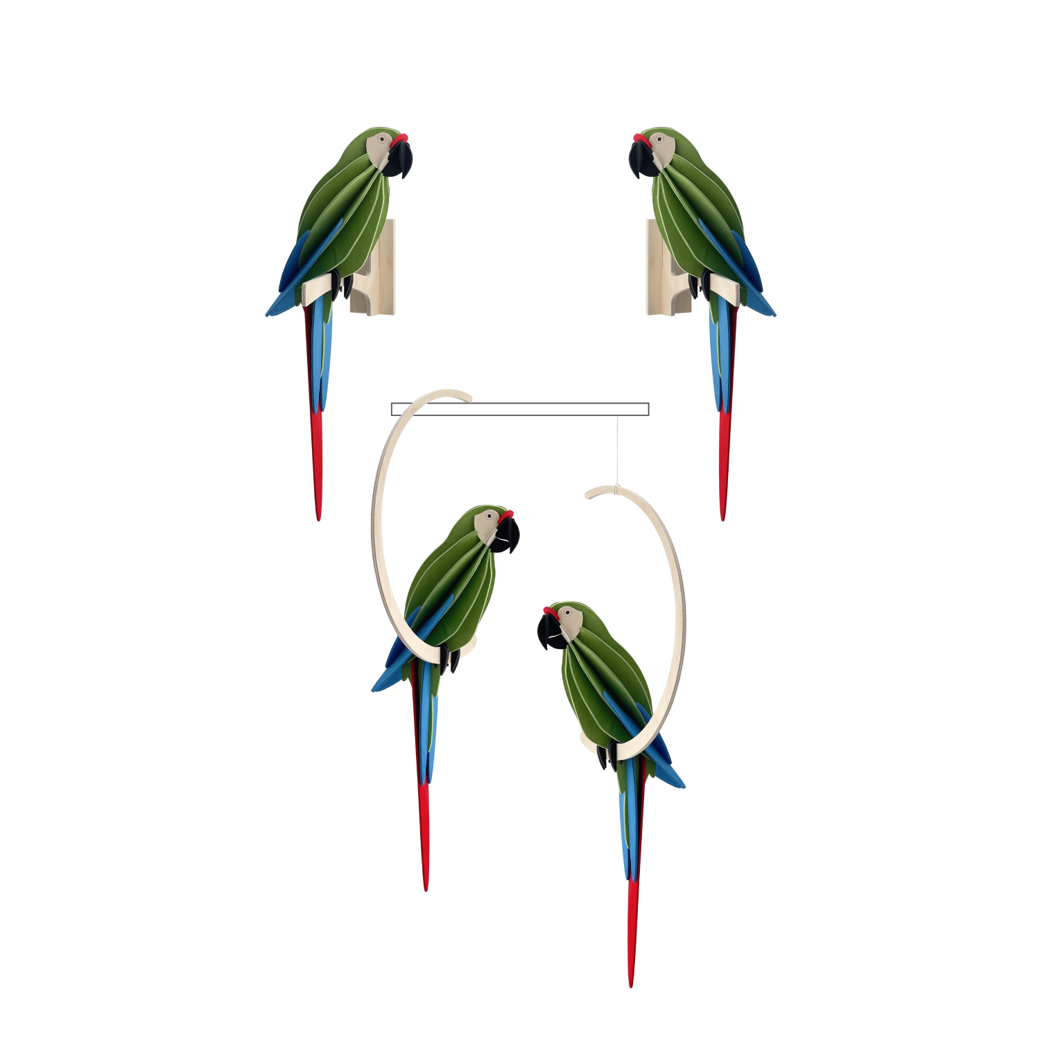 - The wooden crescent and string found in the package allow you to hang the parrot from the ceiling.