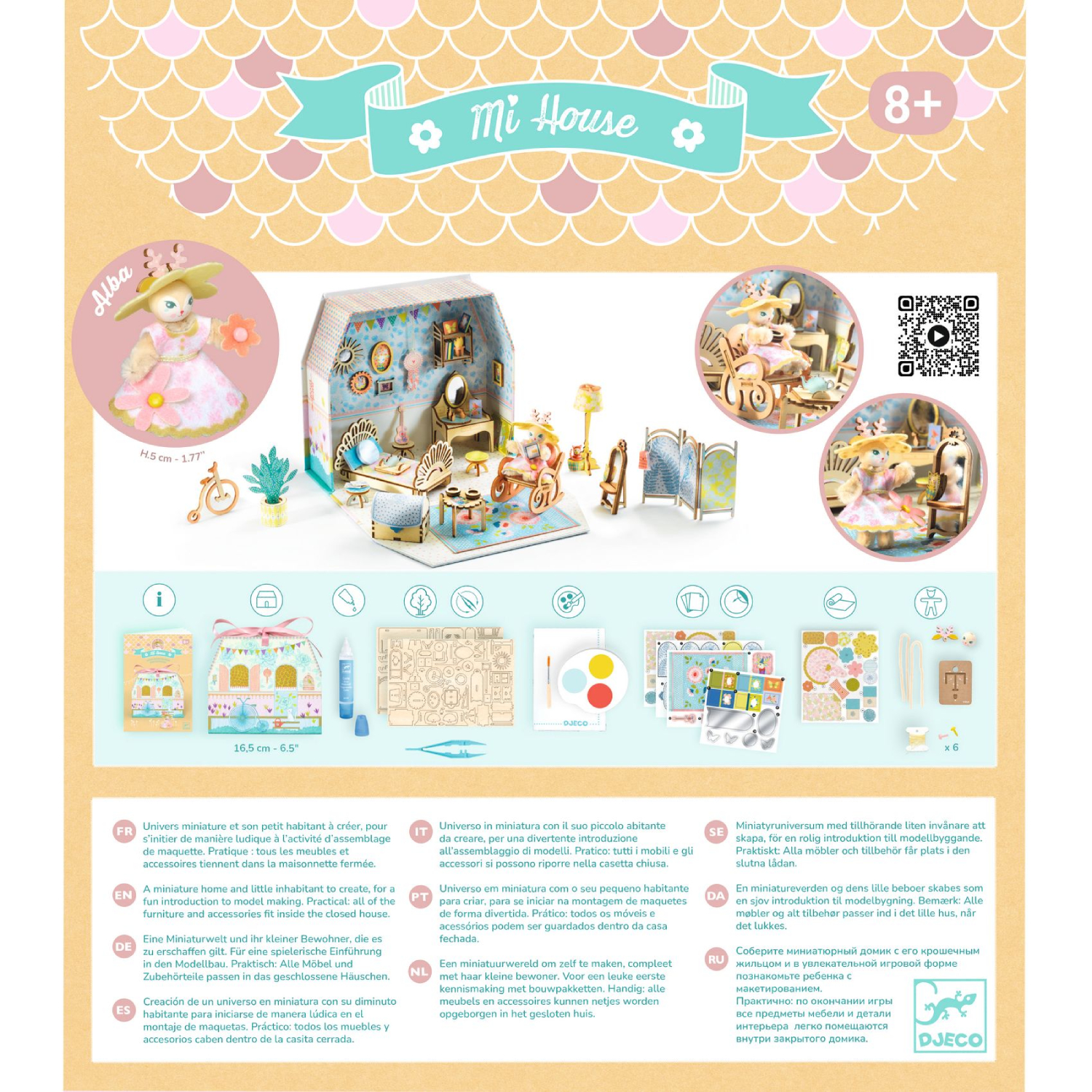 • 1 little house (closed size: 14.5 x 16.5 x 5 cm), 2 glazed wooden boards, 1 palette of dry paints and 1 paintbrush, 1 protective tablecloth, 3 sheets of pre-cut illustrated card, 3 sheets of stickers (1 sheet of illustrated stickers, 1 sheet of small transparent stickers, 1 sheet of double-sided foam stickers), 4 pipe cleaners, 1 illustrated wooden head and ears, 1 spool of thread, 1 sheet of pre-cut illustrated felt, 6 brad fasteners, 1 cardboard tool for making the mini character, 1 pair of precision tweezers, 1 tube of liquid glue with a fine tip, 1 set of detailed instructions