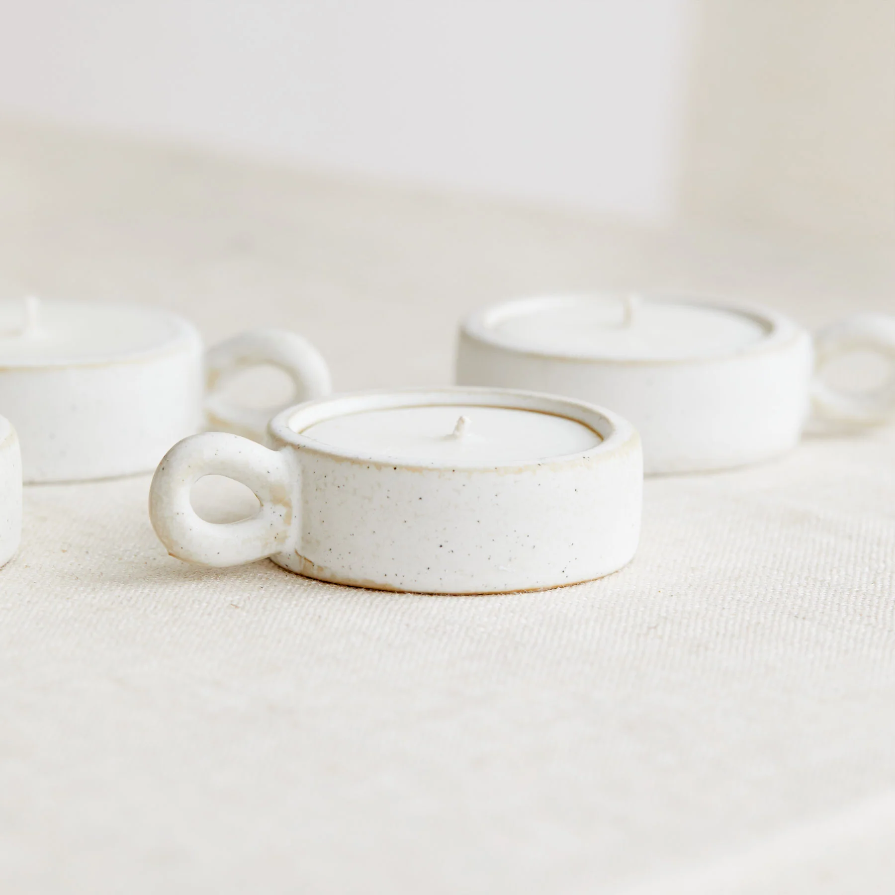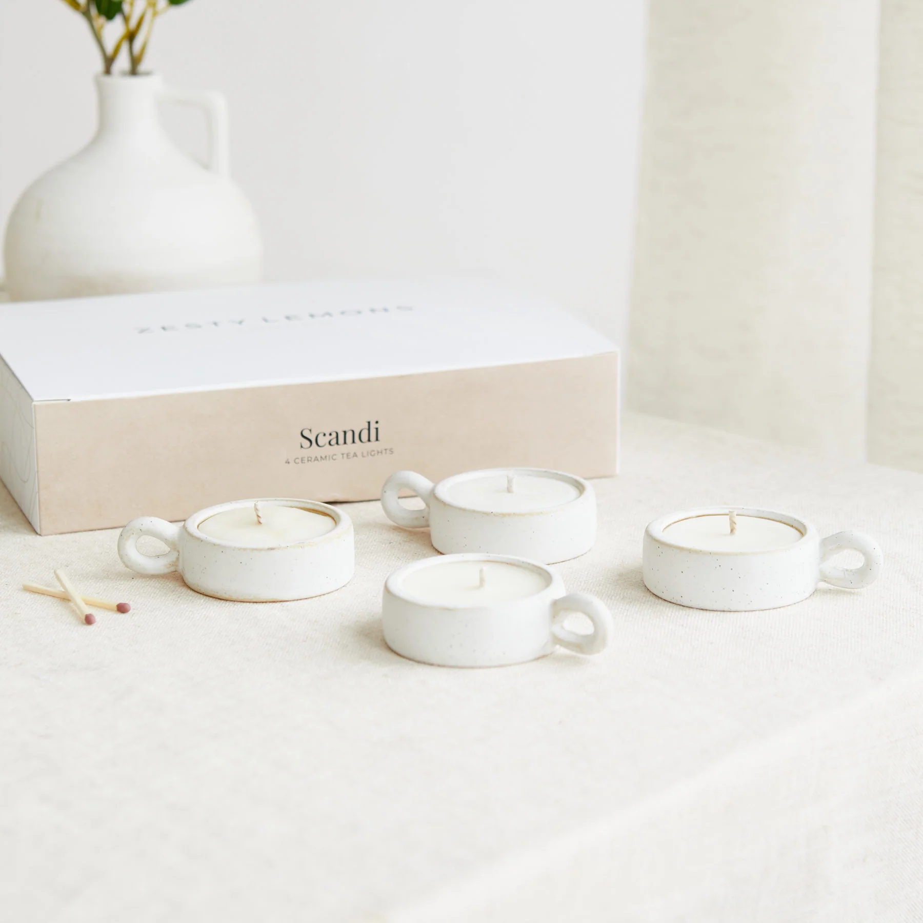 These 4 elegant ceramic tea lights with a handle and speckled nude colour is perfect to add a minimalist touch to any home. These tea lights are presented in a beautiful gift box and the vessels can be reused by adding a standard sized tea light inside.