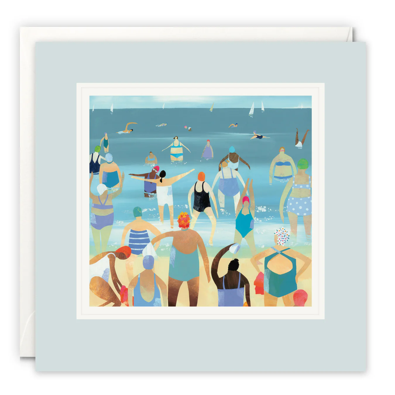 A high quality blank art card by Claire Henley. The artwork on the front of the card features features women in colourful bathing costumes swimming at the beach